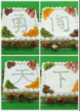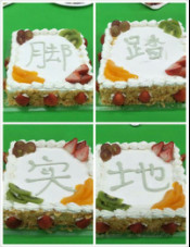 八個方形生日蛋糕一字排開,寫著今年的標(biāo)語腳踏實(shí)地,勇闖天下。